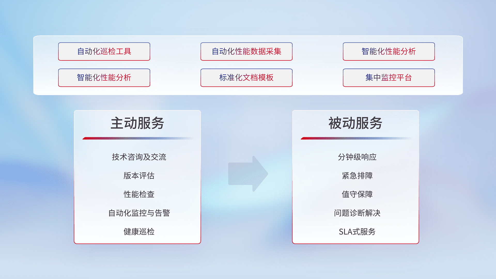 智能化工具和标准化文档,,保障服务质量,,,提供主动服务(包含技术咨询、、、、版本评估、、性能检查、、自动化监控与告警、、、健康巡检)和被动服务包含(分钟级响应、、、紧急排障、、值守保障、、、问题诊断解决、、、SLA服务)。。。