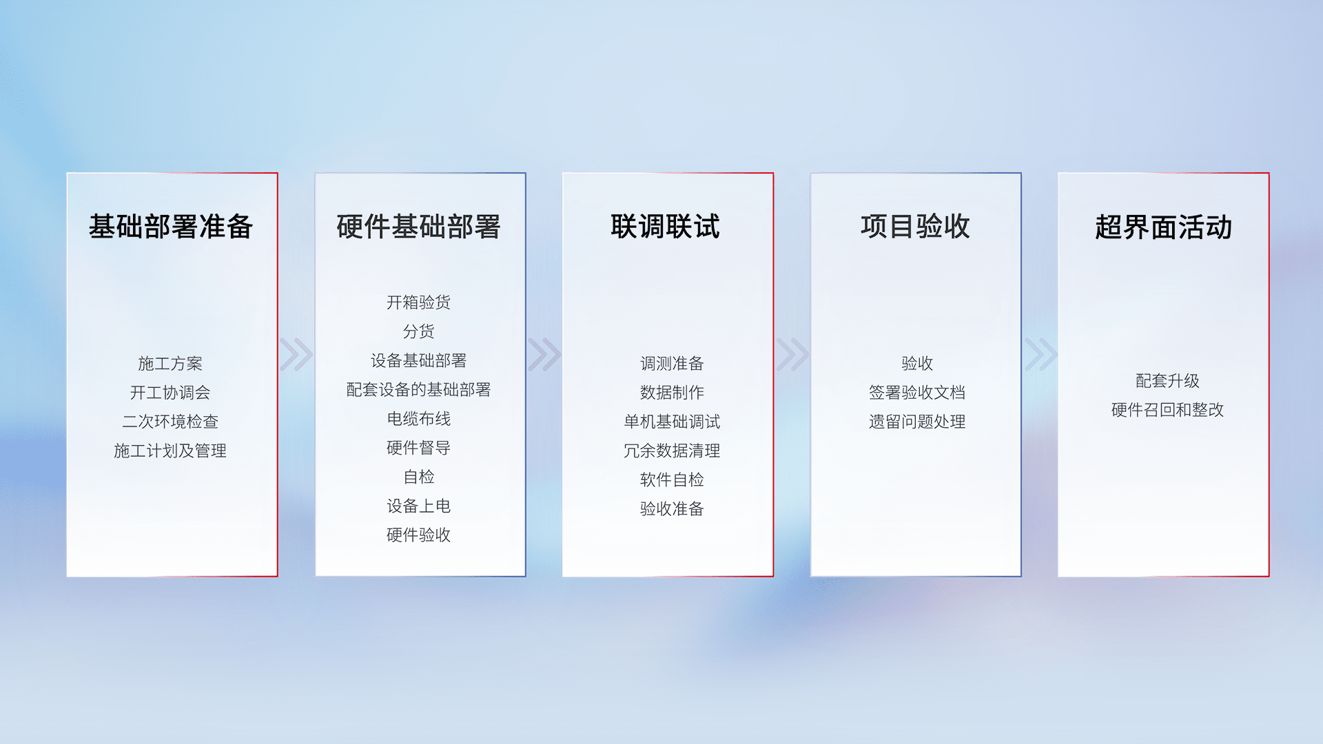从基础部署准备、、、硬件基础部署、、联调联试、、、、项目验收、、、、越界面活动的全过程可追溯,,,保证施工质量和进度。。